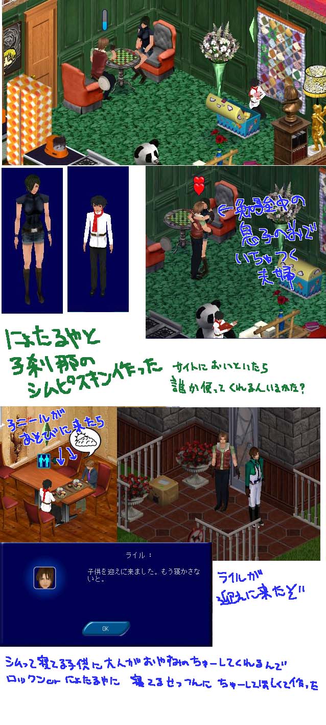 シムって、子供シムが寝ている所に、大人シムがおやすみにキッスをしたりするってーのにで、ロックンやにょたるやにせっつんにおやすみのキッスしてほしくなって。