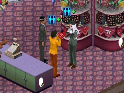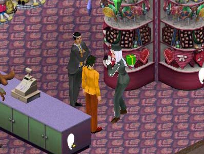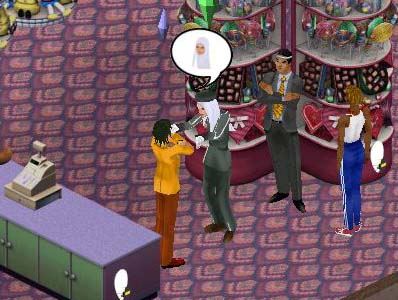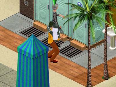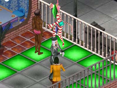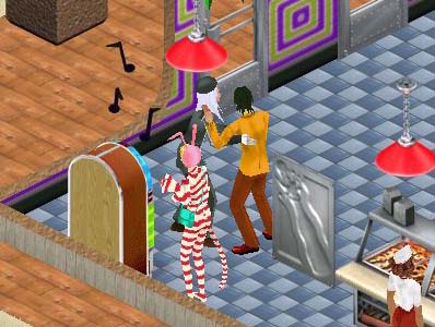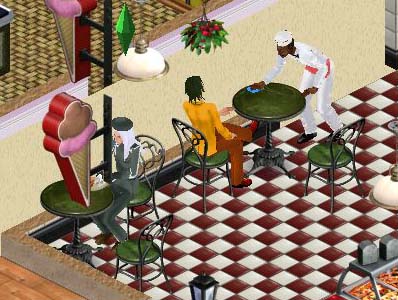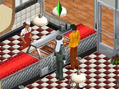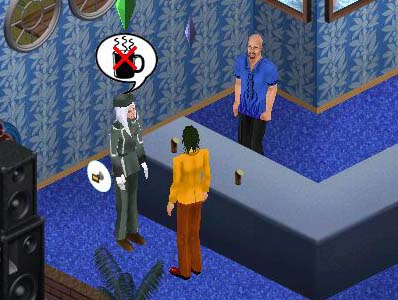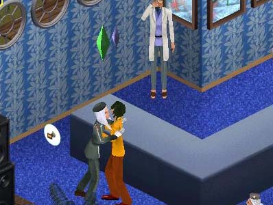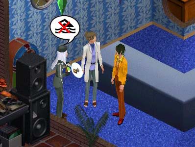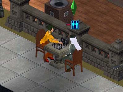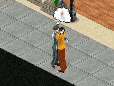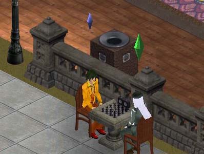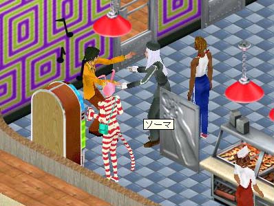 しかし、照れているのか、何故か背中合わせです……それでも話に盛り上がれるシムって不思議。