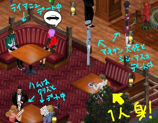 シムピはダウンタウン等にデートに行くと、結構タウニーや近所さん、はてまた家族キャラがうろついている事が多いのです。結構色んなキャラがウニロロしてます。一人のときはここぞとばかりに挨拶したりするけどね。