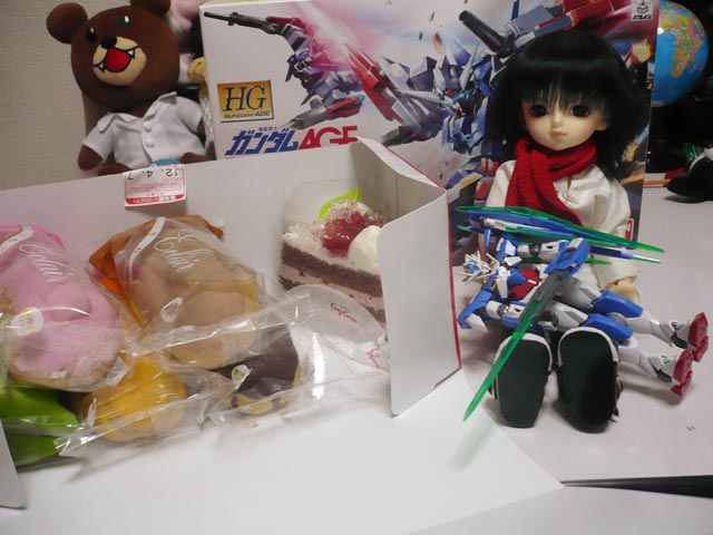 エクシアと名前が一番近いエクレア(しかも5食全部買ったらロクアレカラー迄揃ったと言う)と、チェリーのケーキです。ブルーベリーにしようかと思ったけど、こっちの方が新製品+セールだったので……