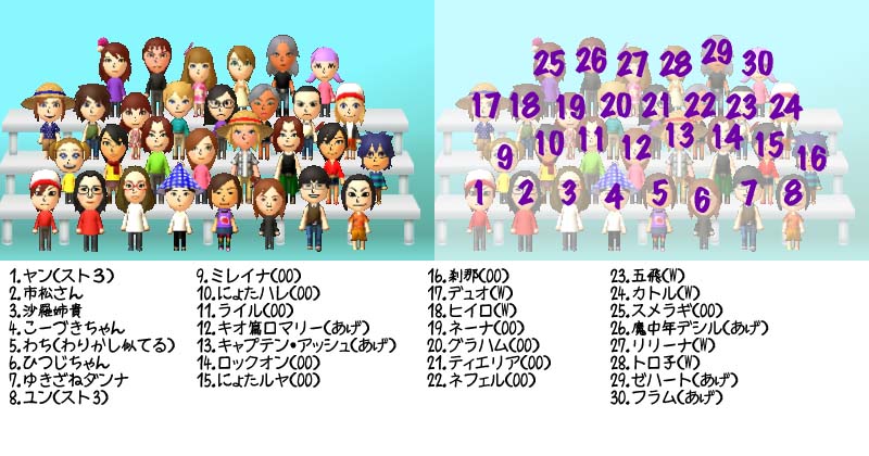 これが現在の住人。番号2〜7まではリアル友人達なのですみませぬ。アニさんは画像資料も一切ないので作れんかった……ゆきざねダンナを作成するにあたって、沙羅姉貴に協力してもらいました。(つか、ダンナのMiiの写メ送ってもらって作成>作成写メを送って添削してもらう)