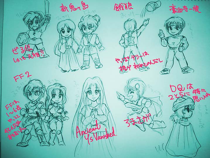 あとロマサガの他にも、マジドロ、ミスティックアーク、MOTHER2とか、格ゲだとサムスピ、ギャラファイ、ラスブロ、バ^チャ、サイキ、水滸演舞、形意拳とかもう色々あって……